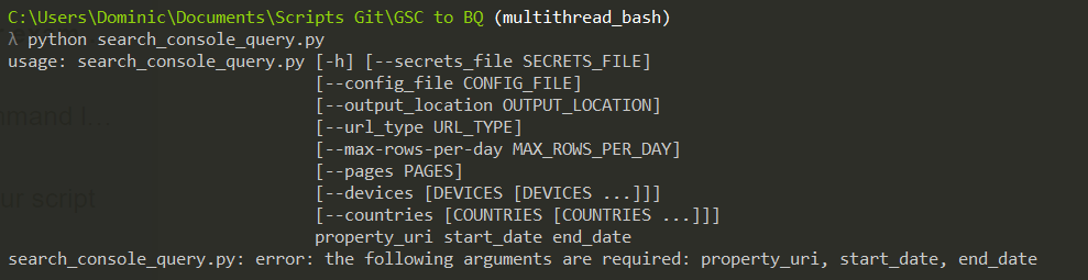 Now that we’ve installed all the things the script needs, we can try again (remember, you can just press up to see the previous command). Now we should get the script help, which will tell us how to run it. Any well-documented script should return something like this: